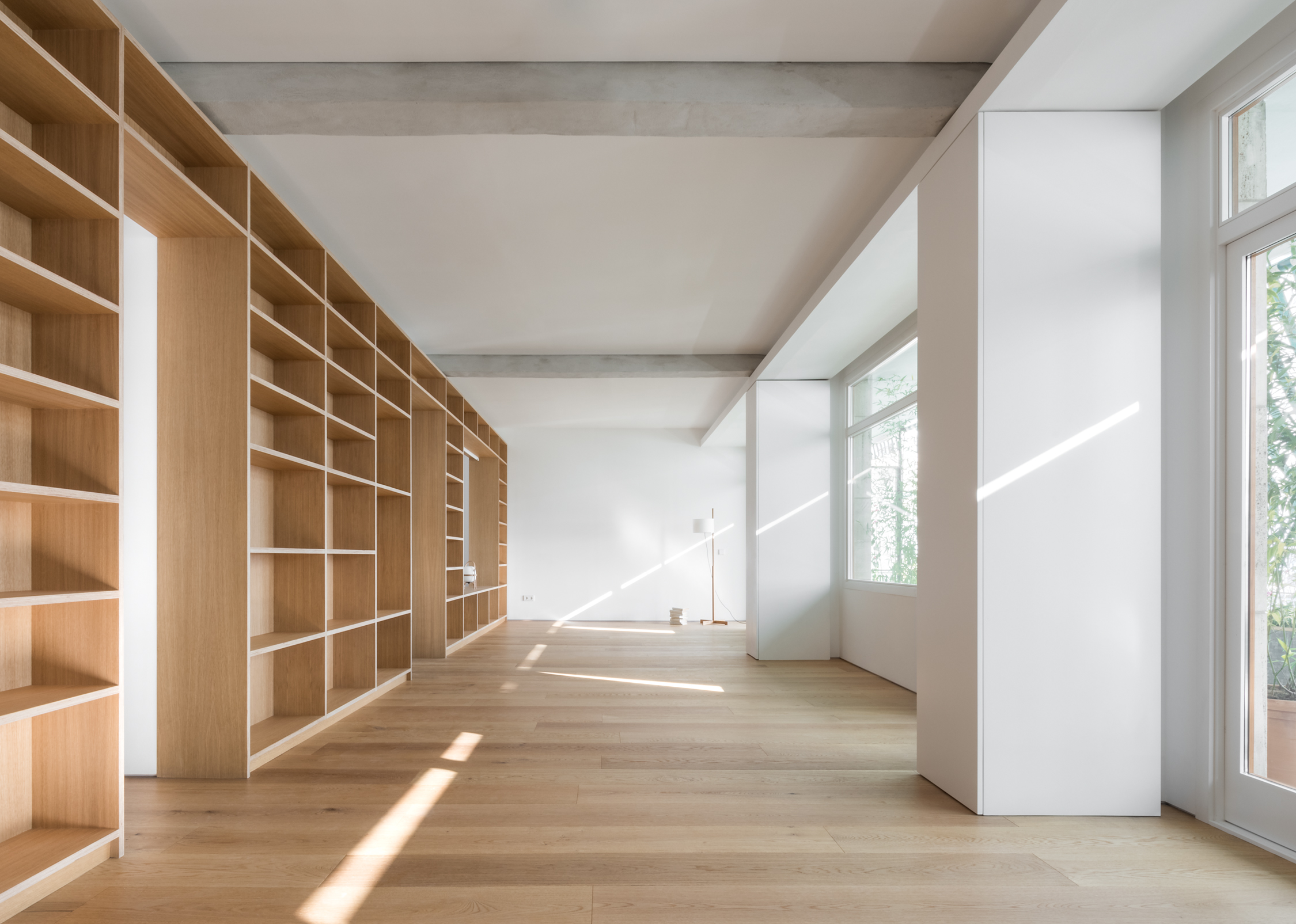 Following the logic of a sailboat, and with an apartment depth of 12 meters, we manage to fit three bedrooms, the kitchen, and two bathrooms, as if we were anchoring a Swan 40 S&S inside the house, adapting its distribution by integrating solutions and mechanisms typical of a sailboat, such as folding bunk beds, extendable beds, and different types of storage spaces (clothes, sheets and towels, dishes, appliances, etc ...). On the perimeter, the 'hull frames' would be used to house the 3000-volume library.