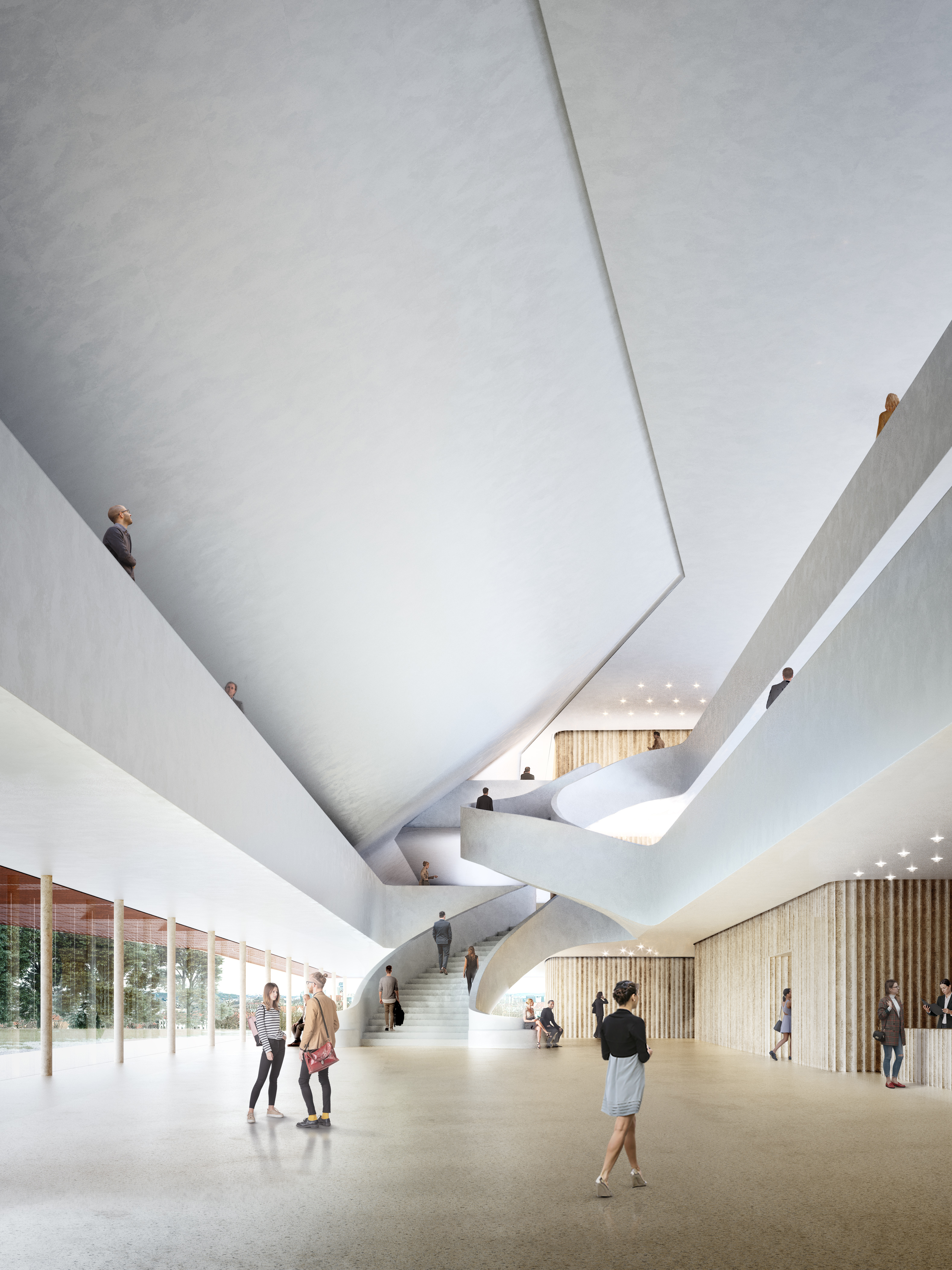 This new urban landmark can be understood as an encompassing roof that shelters the architectural program, whilst simultaneously establishing a formal relation with the roofscape of Vilnius. The main geometry results from a parametric relation between the two performance halls, which provide the two “roof summits”.